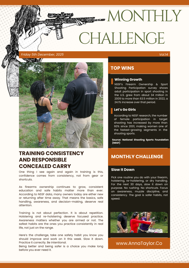 Monthly editorial focused on firearms training, safety, and responsible concealed carry. Includes industry context, educational insights, and a practical challenge to encourage safer habits.